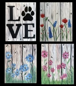 Come and paint with us! We’ll be painting “Wood Fence” Saturday, April 25 from 6:00PM to 8:30PM at The Elks in Riverton. We have TONS of stencil options (Steamboat, paw prints, a heart, cats, kittens, tons of dog breeds, etc) for the “O” in Love, and all of the backgrounds are the same! It can also say” HOME” with an “O” of your choice! Your $35 ticket includes: 2.5 hours of painting • 16 x 20 stretched canvas to take home • Your own easel to work on • Paint, brushes, and aprons • Help from the artist so you can go home loving your new piece! • Great Music!
