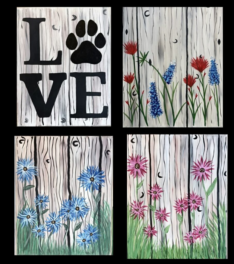 Come and paint with us! We’ll be painting “Wood Fence” Thursday, April 30 from 6:00PM to 8:30PM at Santa Fe in Rock Springs. We have TONS of stencil options (Steamboat, paw prints, a heart, cats, kittens, tons of dog breeds, etc) for the “O” in Love, and all of the backgrounds are the same! It can also say” HOME” with an “O” of your choice! Your $35 ticket includes: 2.5 hours of painting • 16 x 20 stretched canvas to take home • Your own easel to work on • Paint, brushes, and aprons • Help from the artist so you can go home loving your new piece! • Great Music!